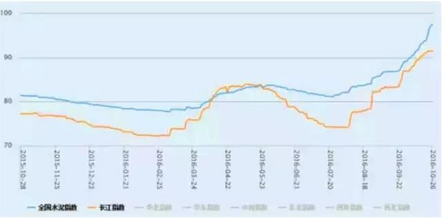 最近一年全國水泥價(jià)格指數(shù)(藍(lán)色線)和長江指數(shù)(紅色線)走勢