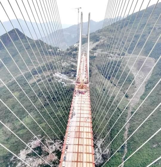 大橋為七跨連續(xù)鋼桁梁斜拉橋,全長1341.4米,主跨達(dá)到720米,在鋼桁梁斜拉橋中跨度排名世界第二。如此高的高度,如此龐大的橋體,能橫亙在大峽谷兩岸而穩(wěn)如泰山,橋上的斜拉索體系起著至關(guān)重要的作用。
