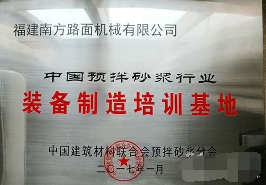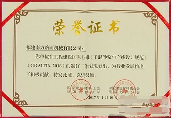 2017年1月10日,在2017'首屆中國國際預(yù)拌砂漿裝備技術(shù)研討會暨預(yù)拌砂漿綠色生產(chǎn)裝備及機(jī)械化施工技術(shù)峰會上,福建南方路面機(jī)械有限公司被中國建材聯(lián)合會預(yù)拌砂漿分會授予“中國預(yù)拌砂漿行業(yè)裝備制造培訓(xùn)基地”;同時,因在國家標(biāo)準(zhǔn)GB51176-2016《干混砂漿生產(chǎn)線設(shè)計(jì)規(guī)范》編制工作中的特殊貢獻(xiàn),被授予“特別貢獻(xiàn)單位”。
