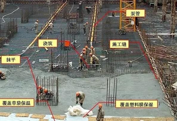 6、大體積泵送混凝土經(jīng)振搗后表面水泥漿較厚,容易引起表面裂縫。首先,要求在振搗最上一層混凝土?xí)r,控制振搗時(shí)間,注意避免表層產(chǎn)生太厚的浮漿層;在澆搗后,必須及時(shí)用2m 長(zhǎng)括尺,將多余浮漿層刮除,按照標(biāo)高控制點(diǎn),將混凝土表面括拍平整。有凹坑的部位必須用混凝土填平,在混凝土收漿接近初凝時(shí),混凝土面進(jìn)行二次抹光,用木蟹全面仔細(xì)打抹兩遍,既要確?;炷恋钠秸?,又要把其初期表面的收縮脫水細(xì)縫閉合,在混凝土收漿凝固施工期間,除了具體施工人員外,不得在未干硬的混凝土面上隨意行走,收漿工作完成的面必須同步及時(shí)覆蓋薄膜。