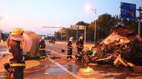 到達現(xiàn)場后,消防官兵經(jīng)過現(xiàn)場偵查發(fā)現(xiàn)水泥攪拌車與路中央護欄猛烈碰撞。事故中,攪拌車車頭損毀嚴重,車頭零部件散落一地,攪拌車司機被變形的車頭緊緊卡住,無法動彈,情況萬分危急。了解情況后,消防官兵決定利用液壓擴張器和撐頂桿對駕駛室變形部位進行破拆,對被困人員實施營救,并做好現(xiàn)場警戒,防止發(fā)生二次事故。