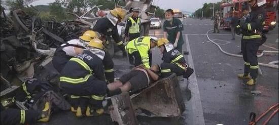 由于駕駛室變形嚴重,救援難度較大,為全力救出被困者,消防官兵首先利用擴張器從左側(cè)車門擴張,而后用撐頂桿對壓住被困者的變形車窗中間部位一點一點進行擴張,并小心翼翼地挪動被困者的身體,發(fā)現(xiàn)車門位置已經(jīng)變形卡主被困人員,現(xiàn)場指揮員果斷命令用無齒鋸對車門部位切割并用戰(zhàn)斗服蓋住被困人員防止?fàn)C傷,水槍一直保持充實水柱狀態(tài)。