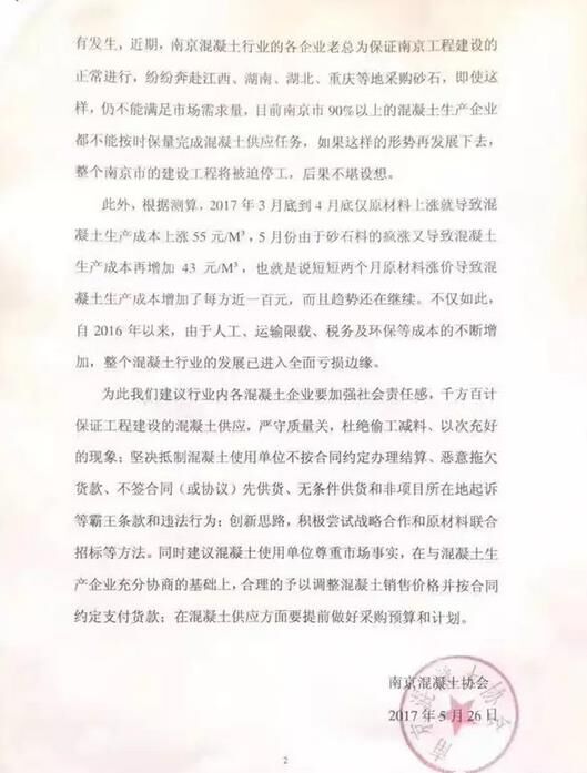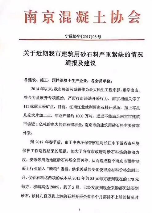 5月26日,南京混凝土協(xié)會關于近期南京市建筑用砂石料嚴重緊缺的情況發(fā)布通報及建議。公告中提到:目前江南江北僅剩的兩家石料開采場遠遠不能滿足南京市建筑市場近1億噸的砂石需求量,全市建筑用砂石料主要依靠外采。尤其是在今年春節(jié)以后,中央環(huán)保督察組對長江中下游省市環(huán)境保護巡視結果的通報,加大了各省市政府對砂石料場的整治力度,周邊地區(qū)砂石料場全面關停,從而造成全市預拌混凝土行業(yè)陷入“斷糧”的困境,這也直接導致原材料價格急劇上升。