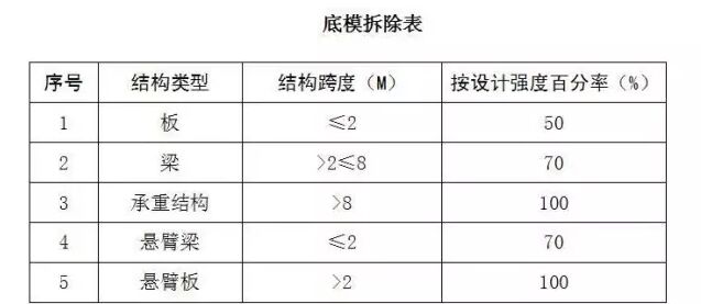 底模:構件跨度大于8m的混凝土強度達到設計強度的100%后,方可拆除。構件跨度小于8m的混凝土強度達到設計強度的75%后,方可拆除。預應力部位的拆模為達到設計要求的混凝強度和預應力完成后拆除。