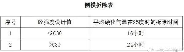 側模:在混凝土強度能保證表面棱角不因拆除模板而受損壞后,方可拆除。