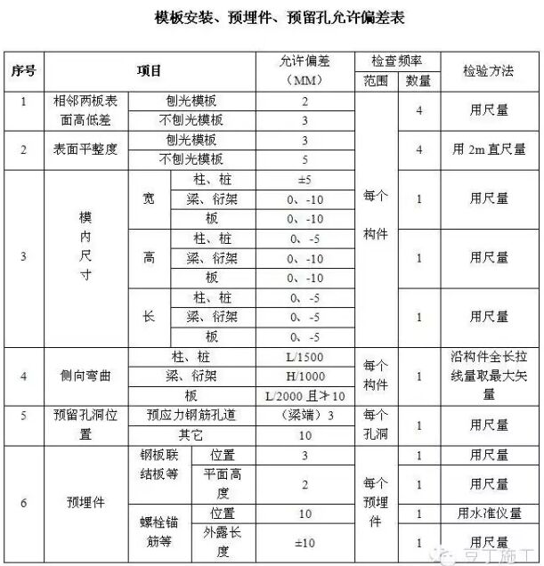 模板安裝、預埋件及預留孔施工允許偏差見《模板安裝、預埋件、預留孔允許偏差表》