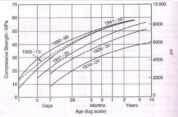 現(xiàn)在水泥與100年前水泥不相同大了去了?,F(xiàn)有很多高強水泥可采用高C3S、低C2S,高細度的方式實現(xiàn)早期高強目標。盡管使用“高強水泥”可以降低規(guī)定強度的水泥用量、加快拆模、加速工程進度而使建設(shè)總承包方獲取豐厚利益,但是高水膠比和低水泥用量容易導(dǎo)致混凝土的滲透性較高,一般耐久性較差。過高早期強度和過早放棄模板的有效養(yǎng)護同樣對工程質(zhì)量產(chǎn)生安全隱患。