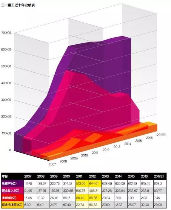 顯然,彼時(shí)三一的主營(yíng)業(yè)務(wù)利潤(rùn)持續(xù)大跌,倒逼著三一不得不做出改變。三一重工的財(cái)報(bào)顯示,2015年和2016年是該公司近十年來(lái)業(yè)績(jī)最差的年份,凈利潤(rùn)分別為1.39億元和2.03億元。