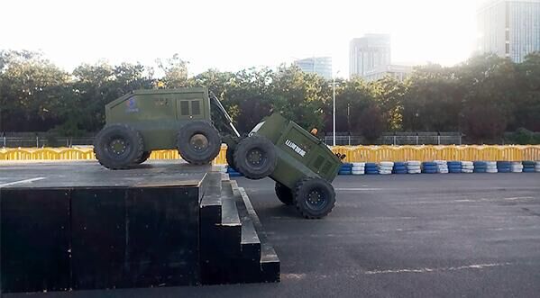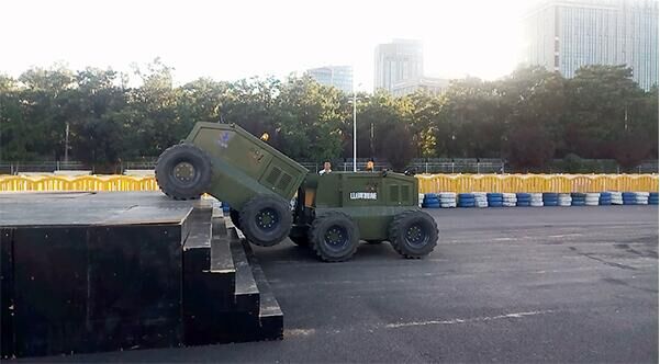 在翻越障礙物的過(guò)程中,車體姿態(tài)靈活變化,輕松攀越高臺(tái),現(xiàn)場(chǎng)驚嘆與掌聲不斷。