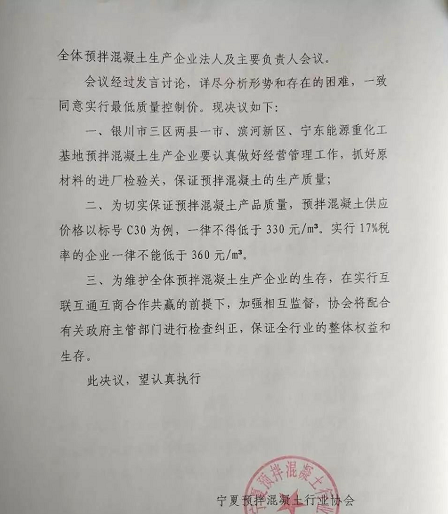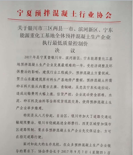 面對如此大的生存危機(jī),寧夏混凝土協(xié)會于9月7日召開了銀川市三區(qū)兩縣一市、濱河新區(qū)、寧東能源重化工基地全體預(yù)拌混凝土生產(chǎn)企業(yè)法人及主要負(fù)責(zé)人會議。會議一致同意實行最低質(zhì)量控制價。預(yù)拌混凝土供應(yīng)價格以標(biāo)號C30為例,一律不得低于330元/方,實行17%稅率的企業(yè)一律不能低于360元/方,以切實保證當(dāng)?shù)仡A(yù)拌混凝土質(zhì)量。