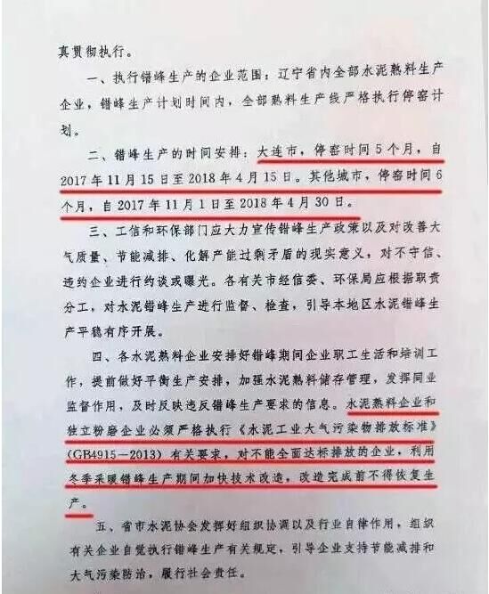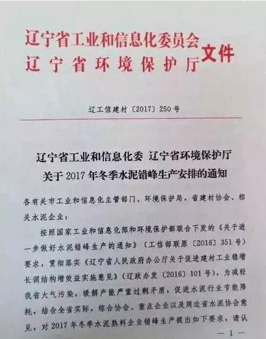 日前,遼寧省工信委和遼寧省環(huán)保廳聯(lián)合發(fā)文要求遼寧省水泥企業(yè)于今年11月開(kāi)始啟動(dòng)水泥行業(yè)采暖季錯(cuò)峰停產(chǎn)計(jì)劃,除大連市以外的其他城市的全部水泥熟料生產(chǎn)企業(yè)錯(cuò)峰停產(chǎn)6個(gè)月,錯(cuò)峰生產(chǎn)自今年11月1日起停至明年春天4月末結(jié)束。