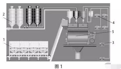 圖1為某商品混凝土攪拌站生產(chǎn)程序主界面的背景圖。1.配料機(jī),骨料秤;2.水泥煤灰等粉料倉(cāng),通過(guò)螺旋機(jī)輸送到水泥秤和煤灰秤的秤斗里,疊加秤;3.水泵;4.添加劑泵;5.攪拌機(jī)。