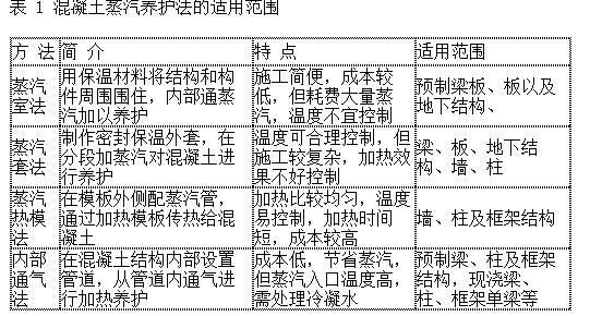 蒸汽法養(yǎng)護(hù)按照不同的加熱方式可以分為蒸汽室法、蒸汽套法、毛管模板法、蒸汽熱模法和內(nèi)部通氣法,其特點(diǎn)及使用的范圍見(jiàn)表 1。