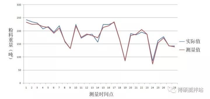 輸出重量信息,測量結果準確,避免了溫度、壓力、粉塵、架橋、塌陷等環(huán)境因素的影響。以下圖示為一定時間段內(兩個月),粉料重量的實際值與測量值之間的對比曲線。