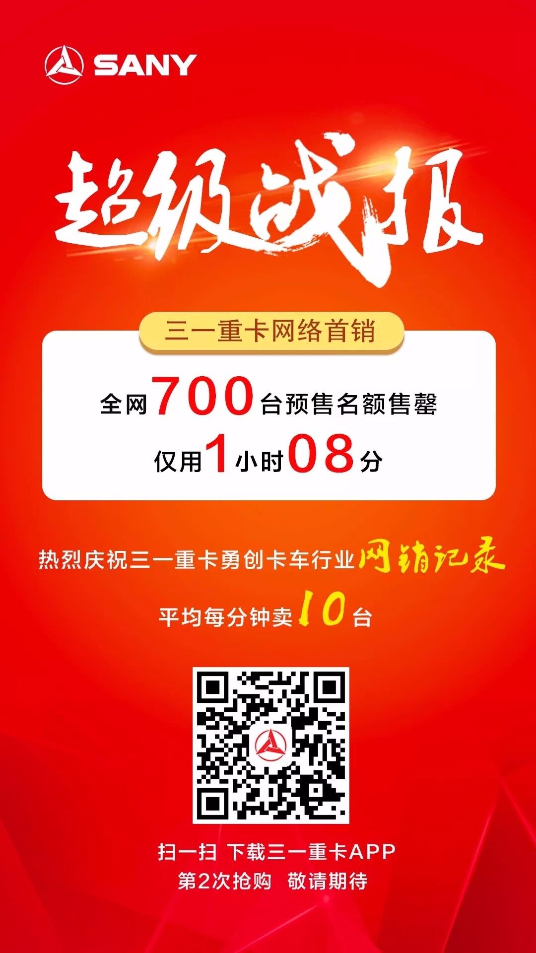 導語:2018年3月31日,三一重卡首批700臺預售名額在網(wǎng)絡上鳴鑼開賣,僅用1小時8分鐘,700臺預售名額搶購一空,不僅開創(chuàng)了重卡廠家網(wǎng)絡直銷的先河,更是創(chuàng)造了重卡互聯(lián)網(wǎng)銷售臺數(shù)和總金額的雙重紀錄!