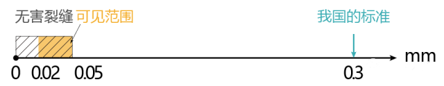 在正常使用荷載作用下,鋼筋混凝上結構一般是帶裂縫工作的,一般肉眼可見的裂縫范圍為0.02~0.05mm,裂縫寬度小于0.05mm 的屬無害裂縫,對防水、防腐蝕與承重的影響均可忽略不計。