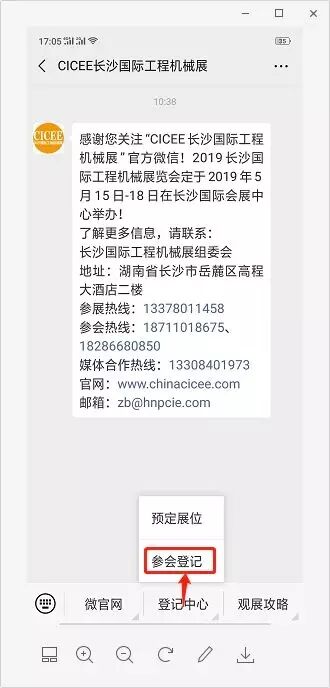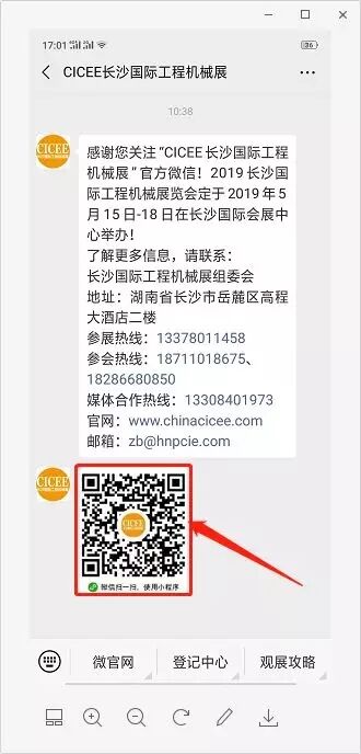 第1步,掃碼關注“CICEE長沙國際工程機械展”微信公眾號,點擊“參會登記”,獲取小程序二維碼。