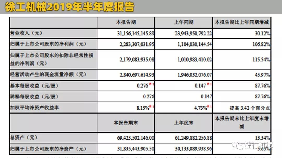 2019年上半年,徐工機(jī)械實(shí)現(xiàn)營(yíng)業(yè)總收入311.56億元,同比增長(zhǎng)30.12%。其中包括海外收入44.48億元,同比增長(zhǎng)20.07%;歸屬于上市公司股東的凈利潤(rùn)22.83億元,同比增長(zhǎng)106.82%。相比較2018年上半年,今年上半年徐工的成績(jī)還是很喜人的,特別是在凈利潤(rùn)這一塊,比去年同期增加了一倍之多。