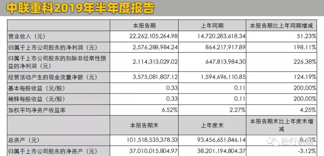 2019年上半年?duì)I業(yè)收入:222.62億元歸屬于上市公司股東凈利潤(rùn):25.76億元8月30日晚,中聯(lián)重科官方發(fā)布了2019年半年度報(bào)告。報(bào)告顯示,中聯(lián)重科上半年實(shí)現(xiàn)營(yíng)業(yè)總收入222.6億元,同比增長(zhǎng)51.23%;包括海外市場(chǎng)實(shí)現(xiàn)營(yíng)業(yè)收入16.84億元,同比增長(zhǎng)2.61%。歸屬于上市公司股東的凈利潤(rùn)25.76億元,同比增長(zhǎng)198.11%。相比較上面的徐工機(jī)械,雖然總營(yíng)業(yè)額相差了88個(gè)多億,但是,凈利潤(rùn)比徐工多了2.93億元。所以,從盈利能力來(lái)說(shuō),中聯(lián)表現(xiàn)比徐工要好。中聯(lián)重科的優(yōu)勢(shì)產(chǎn)業(yè)主要集中在混凝土機(jī)械、塔式起重機(jī)械、環(huán)衛(wèi)機(jī)械、農(nóng)業(yè)機(jī)械這四個(gè)領(lǐng)域?yàn)橹?,其中,建筑起重機(jī)械、長(zhǎng)臂架泵車(chē)保持行業(yè)第一,汽車(chē)起重機(jī)國(guó)內(nèi)市場(chǎng)份額較年初增長(zhǎng)6.8%。從目前中聯(lián)的發(fā)展趨勢(shì)來(lái)看,也在積極的擴(kuò)展高空作業(yè)平臺(tái)、土方機(jī)械、機(jī)制砂、干混砂漿、噴射機(jī)械手等新興業(yè)務(wù)。與此同時(shí),中聯(lián)重科目前也在積極轉(zhuǎn)型,打造人工智能和智能制造,中聯(lián)重科塔機(jī)智能工廠穩(wěn)步達(dá)產(chǎn),高空作業(yè)平臺(tái)臂式智能產(chǎn)線實(shí)現(xiàn)量產(chǎn),攪拌車(chē)智能制造產(chǎn)業(yè)園、液壓關(guān)鍵元件產(chǎn)業(yè)園處于規(guī)劃建設(shè)中。作為老牌的國(guó)產(chǎn)工程機(jī)械品牌,中聯(lián)重科一直以來(lái)?yè)碛泻芎玫钠放瓶诒?,特別是在混凝土機(jī)械領(lǐng)域,擁有眾多的明星產(chǎn)品,碳纖維長(zhǎng)臂架泵車(chē),國(guó)內(nèi)首創(chuàng),大受市場(chǎng)歡迎。