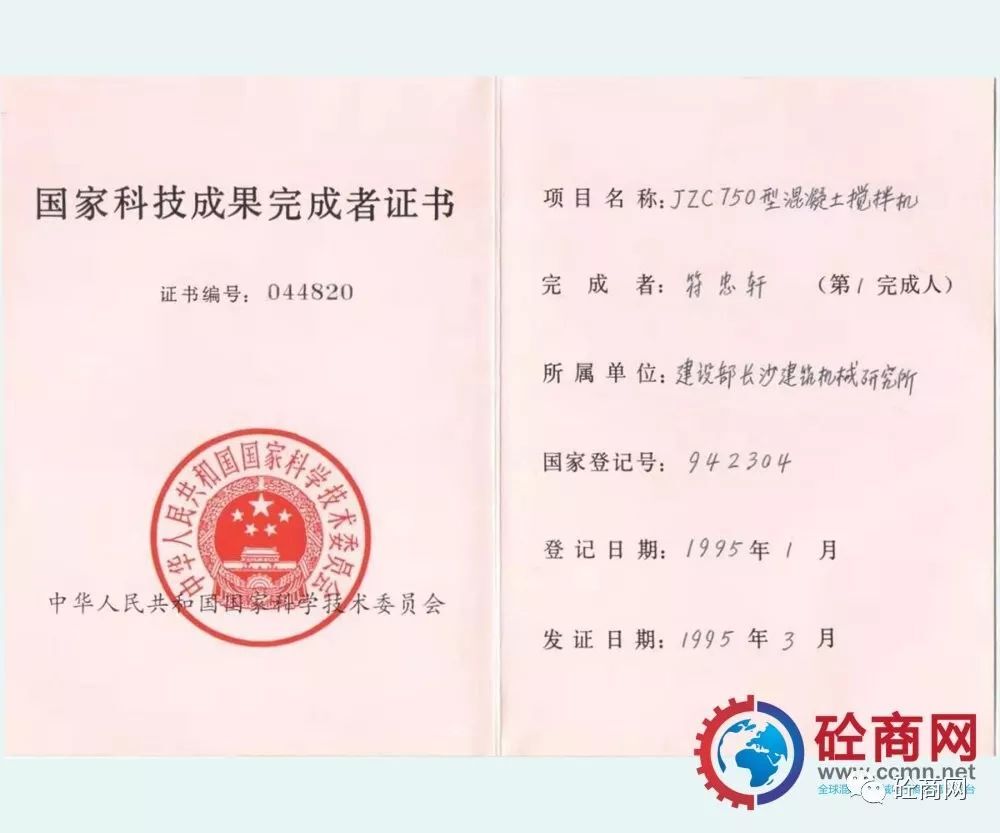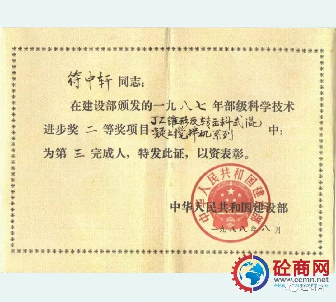 通過(guò)全行業(yè)的不懈努力,改革統(tǒng)型機(jī)型的結(jié)構(gòu)與技術(shù),新型混凝土攪拌機(jī)取得了突飛猛進(jìn)的發(fā)展,并在全國(guó)推廣使用,獲得用戶廣泛的認(rèn)可與好評(píng)。長(zhǎng)沙建機(jī)院負(fù)責(zé)的、本人作為主要參與設(shè)計(jì)者的“JZ錐形反轉(zhuǎn)出料攪拌機(jī)系列”獲建設(shè)部1987年科技進(jìn)步二等獎(jiǎng);代表長(zhǎng)沙建機(jī)所與方圓集團(tuán)合作開(kāi)發(fā)的JZC750混凝土攪拌機(jī),獲得國(guó)家科技成果證書(shū)。