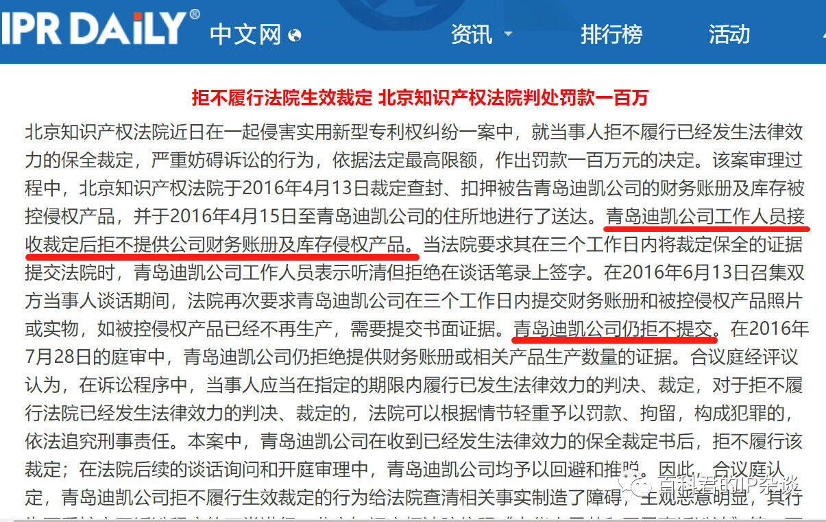 具體點就是,迪凱公司無正當理由,拒絕按照保全裁定提供相關(guān)證據(jù)(甚至還曾被判處罰款100萬),應(yīng)當承擔相應(yīng)的不利后果,從而推定上述主張成立。