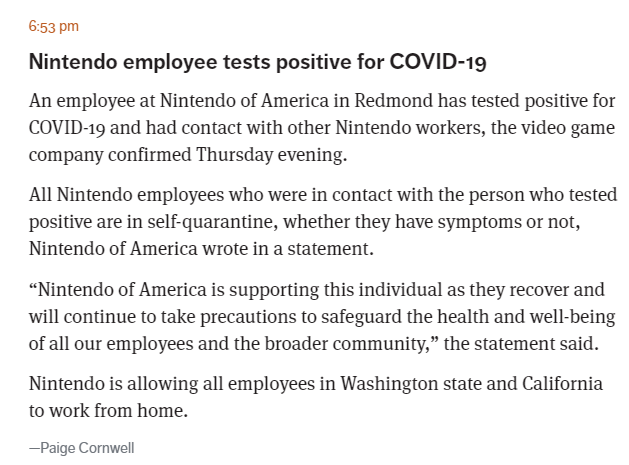 根據(jù)《西雅圖時(shí)報(bào)》的相關(guān)報(bào)道,美國任天堂一名員工目前已經(jīng)出現(xiàn)“新冠病毒檢測陽性”的狀況,目前,與這位員工有過接觸的其他人員已經(jīng)開始自我隔離?!段餮艌D時(shí)報(bào)》報(bào)道原文:
