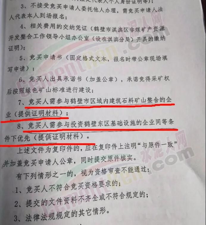 但是,該企業(yè)在參與競標時確被駁回,理由是竟買人需參與鶴壁市區(qū)域內(nèi)建筑石料礦山整合的企業(yè)(提供證明材料);同時要滿足競買人需參與投資鶴壁東區(qū)基礎設備的企業(yè)同等條件優(yōu)先(提供證明材料)。不屬于鶴壁市的企業(yè)或者沒有參于鶴壁市區(qū)域礦山整合的企業(yè)是不能參與競標,這與公告中的強調(diào)的價高者得完全不符。