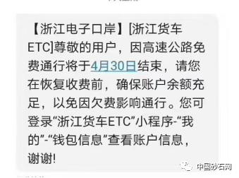 近日,很多浙江ETC用戶收到同樣一條短信,短信的內(nèi)容大致是:因高速公路免費(fèi)通行將于4月30日結(jié)束,請大家保持賬戶余額充足。