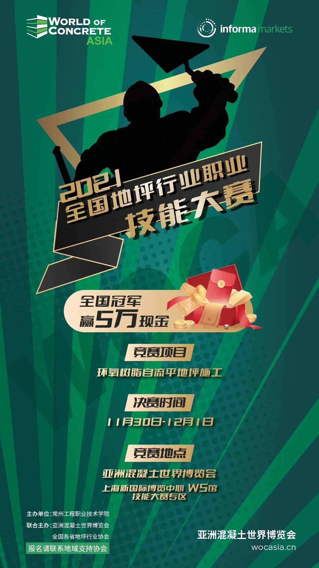 由常州工程職業(yè)技術(shù)學(xué)院、WOCA亞洲混凝土世界博覽會聯(lián)合主辦,地坪產(chǎn)業(yè)學(xué)院和各省地坪行業(yè)協(xié)會協(xié)辦的“2021年全國地坪行業(yè)職業(yè)技能大賽”,將在2021年亞洲混凝土世界博覽會展會現(xiàn)場舉行,全國冠軍將獲得五萬現(xiàn)金!