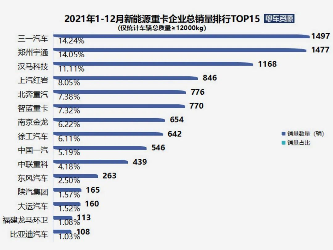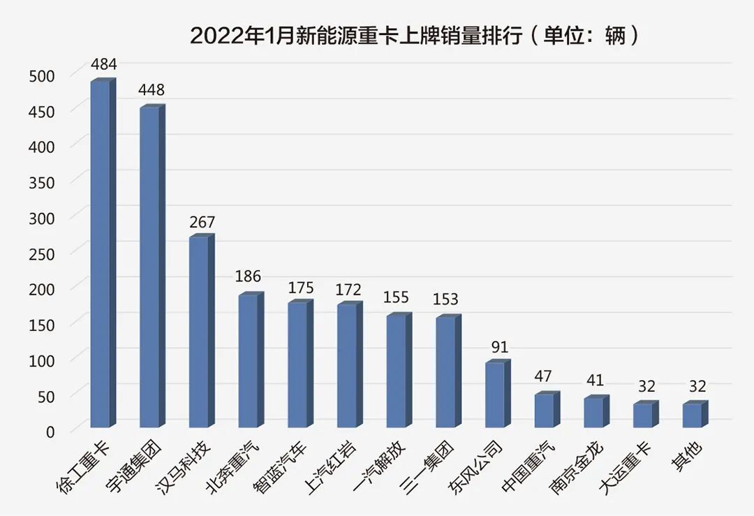特別是在企業(yè)銷量排行榜上,表現(xiàn)最為搶眼的并不是傳統(tǒng)重卡制造商,而是工程機(jī)械企業(yè)跨行業(yè)進(jìn)軍重卡行業(yè)的典型代表——三一汽車與徐工汽車:三一新能源重卡2021年累計(jì)銷量達(dá)到1497輛,同比大增1621%,市場(chǎng)份額達(dá)到14.33%,較上年同期提升了11個(gè)百分點(diǎn);徐工在2022年1月21.2%的月度占有率火熱開(kāi)局,問(wèn)鼎新能源重卡2022首月銷冠。