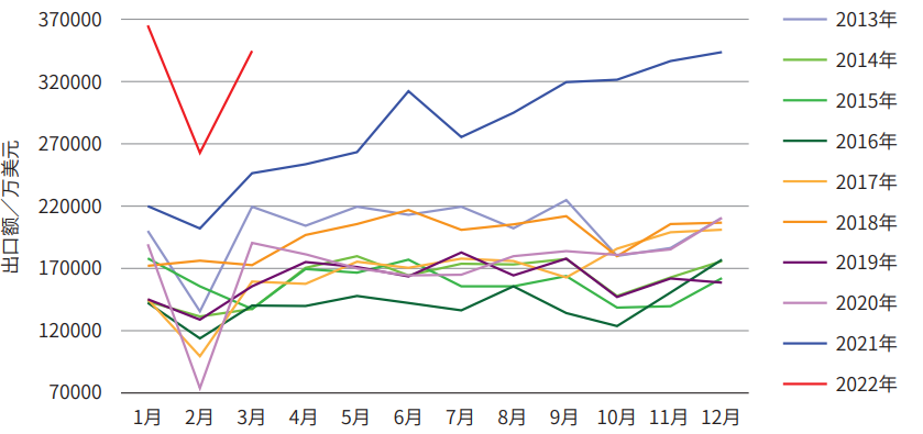 根據(jù)海關數(shù)據(jù)整理,2021年1-3月我國工程機械進出口貿(mào)易額為105.08億美元,同比增長36%。其中進口金額7.85億美元,同比下降22.8%;出口金額97.23億美元,同比增長45%,貿(mào)易順差89.38億美元,同比增加32.49億美元。2022年1-3月各月進出口情況如表1所示,2013年-2022年月度出口金額如圖1所示。