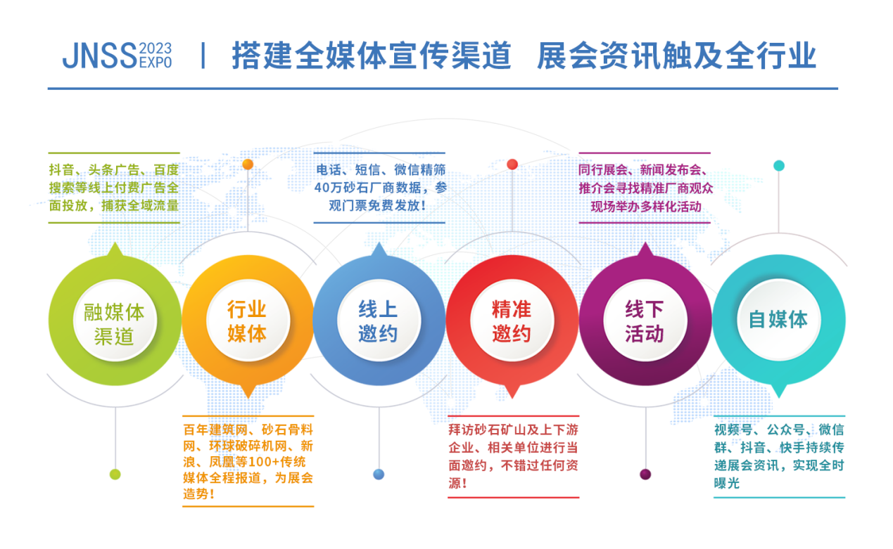 2023濟南砂石招展將持續(xù)加強宣傳力度,匯集線上線下、全方位、多角度優(yōu)質(zhì)買家,助推展商品牌打造與貿(mào)易合作。