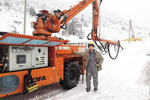 易穎志趕到工地后,發(fā)現設備油漆刮擦嚴重,許多部位變形,與客戶協(xié)調后,易穎志便開始檢測和開機調試。烏茲別克斯坦氣溫很低,夜間最低溫度達到了零下20多度,幾臺設備都在冰天雪地里,為保證設備盡快能使用,易穎志抵抗著極寒天氣在隧道外檢測,做各種調試。由于設備發(fā)生過碰撞,機械變形問題較多,易穎志擔心設備漏油,所以對每個有可能漏油的地方,他都會鉆到車底細心檢查,隨后再檢查設備的各項動作和功能是否正常。他自己檢測一遍后,再教工地上的當地機手如何使用設備、保養(yǎng)設備,并開機試料,及時給出配比意見。
