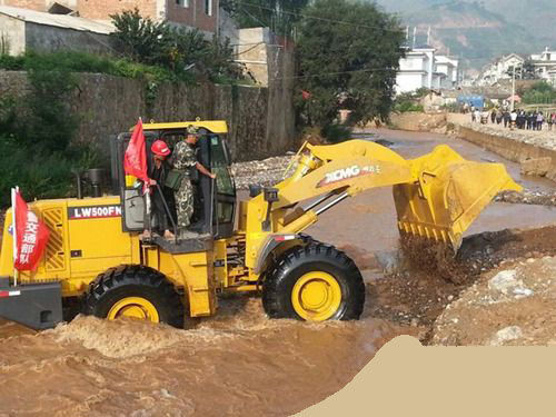 徐工救援隊員早已為車輛做好了一切前期準(zhǔn)備,按照指揮部安排,此臺徐工LW500FN裝載機參與清理災(zāi)區(qū)因塌方被堵塞的河道,并在河道中進(jìn)行鋪設(shè)快速通道工作,從河道中央開出一條水上救援之路。至上午11點,徐工裝載機高效出色地順利完成了任務(wù),不僅排除了水災(zāi)隱患,更在河道中修出一條“生命線”,使后續(xù)救護(hù)車、武警車等救援車輛可以通過這條簡易通道直抵震中,為被困被埋群眾在72小時黃金救援時間內(nèi)獲救爭取到了更多時間。