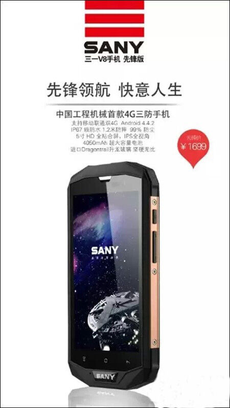 三一V8手機(jī)打破了目前市面上專業(yè)三防手機(jī)售價(jià)高昂的態(tài)勢(shì),以平民的價(jià)格,超高的性價(jià)比和國際一流的品質(zhì),帶給所有工程人員,戶外愛好者全新的品牌體驗(yàn)。SANY V8 PIONEER先鋒手機(jī)將于2015年5月28日在中國率先上市,裸機(jī)售價(jià)為人民幣1699元,國際售價(jià)為349.99歐元。