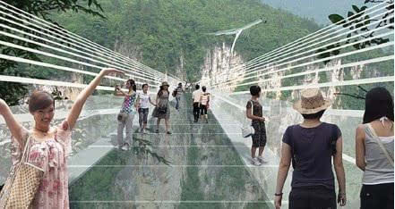 號(hào)稱世界最長(zhǎng)、最高的全透明玻璃橋———據(jù)遺產(chǎn)日?qǐng)?bào): 張家界大峽谷玻璃橋?qū)⒂?月向游客開(kāi)放。玻璃橋總長(zhǎng)430米、寬6米,橋面距谷底約300米,可站800人。整個(gè)工程無(wú)鋼筋混凝土橋墩,同時(shí)肩負(fù)蹦極、溜索、舞臺(tái)等多種功能。