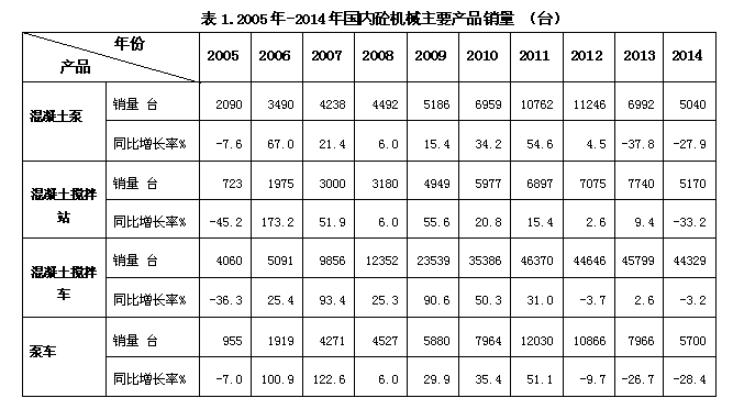 截止到2014年底,中國工程機(jī)械主要產(chǎn)品保有量約為650萬-704萬臺。其中,混凝土攪拌運(yùn)輸車29.2萬-31.6萬臺,混凝土泵車5.9-6.3萬臺,混凝土泵6.3萬-6.8萬臺,混凝土攪拌站4.7萬-5.2萬臺。