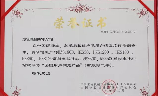 此外,因?yàn)榉綀A集團(tuán)在2015年度全國混凝土機(jī)械行業(yè)用戶滿意度評價(jià)調(diào)查中,受到廣大用戶的一致好評,被授予“全國混凝土機(jī)械用戶滿意十強(qiáng)企業(yè)”稱號。在產(chǎn)品質(zhì)量調(diào)查中,連續(xù)七次被評為“全國用戶滿意單位”。