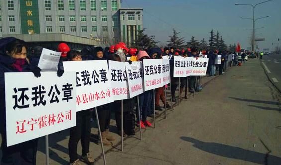 記者看到來自全國(guó)各地的山水水泥職工手舉“還我公章”的牌子,要求山東山水原管理層等人交出50余家水泥廠的公章。