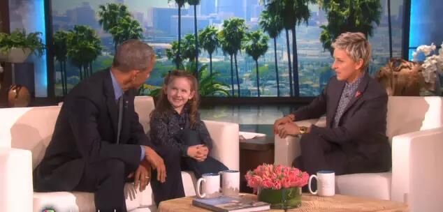 在本次節(jié)目中,主持人狄珍妮(Ellen DeGeneres)首先歡迎6歲的「總統(tǒng)專(zhuān)家」?jié)h斯利(Macey Hensley)出場(chǎng)。這名可愛(ài)的小女孩揮著手走出來(lái),先后擁抱奧巴馬和狄珍妮。