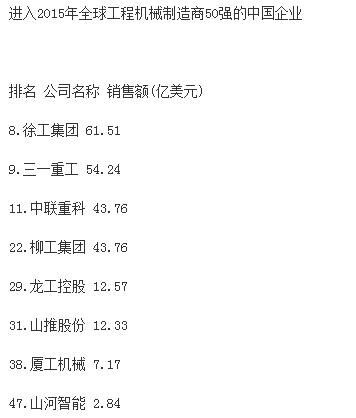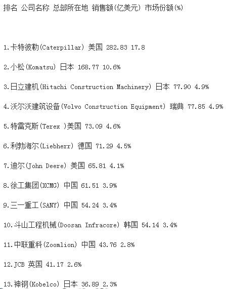 分析指出,受大宗商品價格下跌、新型經濟體經濟增速減緩和世界經濟不景氣的影響,全球前50家工程機械制造企業(yè)總產值較上一年度下跌16.2%,達到1330億美元,創(chuàng)2009年以來新低。據(jù)中國工程機械商貿網編輯了解,2009年,工程機械行業(yè)一年銷售額下降了1090億美元。自那時起,工程機械行業(yè)收入下降趨勢一直未有改變。報告同時強調,榜單上下滑最為嚴重的是中國企業(yè),這很大程度上是因為中國經濟增速的放緩。中國企業(yè)中,只有徐工集團仍然保持在前十強,位列榜單第九位?!斑@個市場趨勢表現(xiàn)最顯著的就是中國建筑設備制造商,相比去年,所有中國企業(yè)的排名有所下滑。排名前十的企業(yè)中,如今只有徐工一家中國工程機械制造廠商?!?/span>