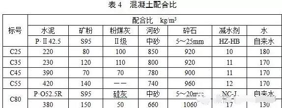 各標(biāo)號(hào)混凝土工作性能良好,坍落度在180mm~210mm之間,無(wú)離析、泌水現(xiàn)象,各標(biāo)號(hào)混凝土配合比如表4所示。