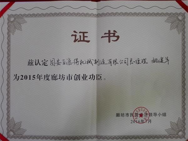 近日,固安百濾得機械制造有限公司總經(jīng)理姚建軍榮獲廊坊市創(chuàng)業(yè)功臣獎,獎金十萬元整,也正是如此,更加說明市場對百濾得的認(rèn)可,百濾得對市場的優(yōu)質(zhì)服務(wù)。