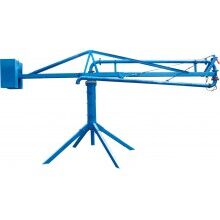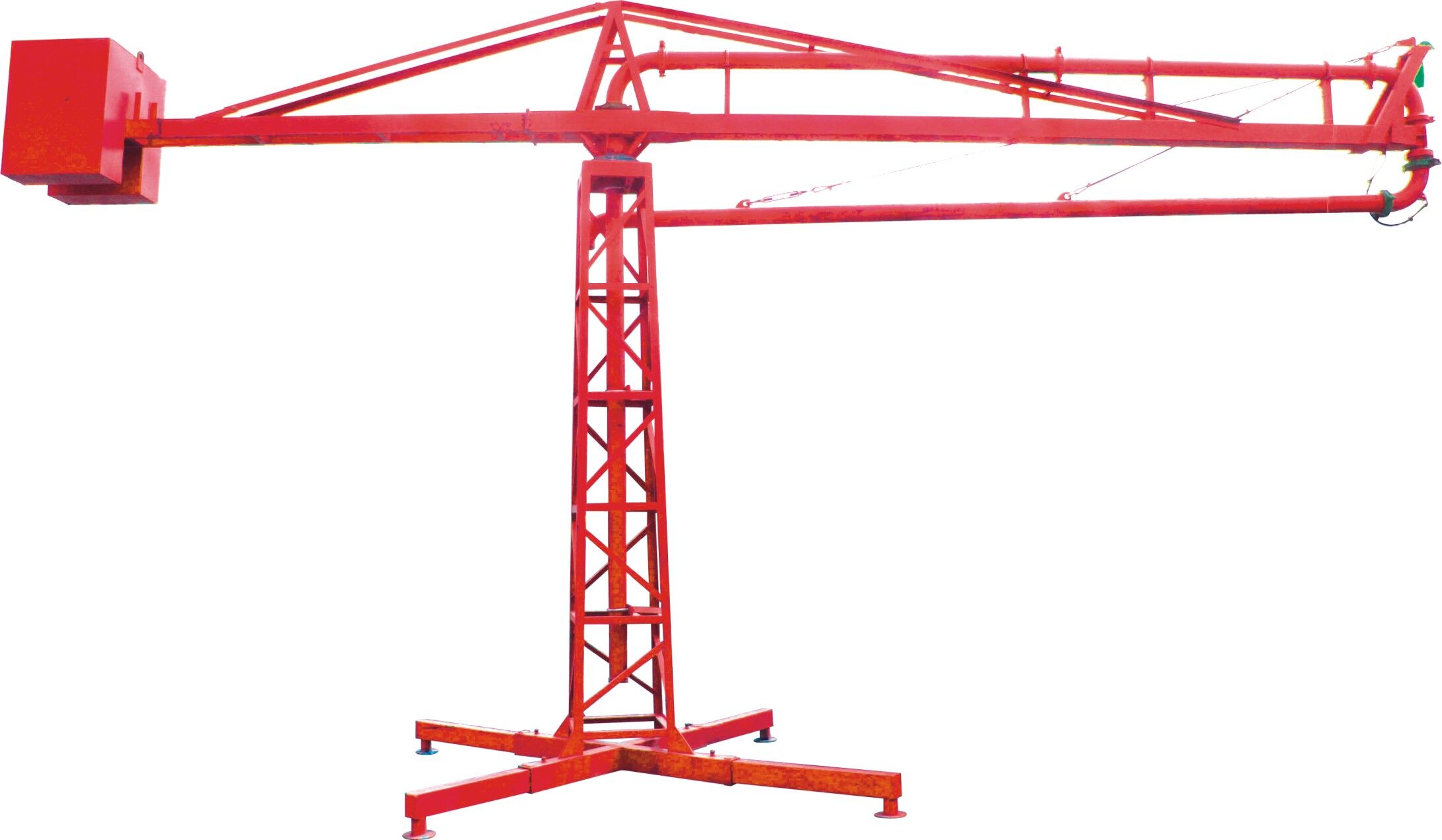 結(jié)構(gòu):、插銷、立架、構(gòu)成的底座是固定部分,其上通過回轉(zhuǎn)支承與上部回轉(zhuǎn)部分相連,上主梁架、平衡臂、平衡臂架拉桿、上橫桿組成后回轉(zhuǎn)部分。立管上有回轉(zhuǎn)卡篐接頭。通過人力拉動,可使整個回轉(zhuǎn)部分回轉(zhuǎn)360度。上梁主架前端連接有一個回轉(zhuǎn)支座與前橫桿、前拉桿組成前回轉(zhuǎn)部分,在人力拉動下可繞回轉(zhuǎn)支座旋轉(zhuǎn)300度。由兩部分回轉(zhuǎn)架組成的合成運動就能覆蓋所有布料半徑范圍的布料點。