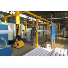 布料機(jī)專利設(shè)計的膠帶機(jī)頭部清掃器是為輸送混凝土清掃砂漿的特殊要求設(shè)計的。刮刀采用硬質(zhì)合金材料,矩型段面,耐磨且不傷膠帶,砂漿損失小。上料膠帶機(jī)設(shè)計為由兩節(jié)輕型桁架的鉸接結(jié)構(gòu),上端鉸接在車架上的轉(zhuǎn)料斗上,通過鉸接油缸根據(jù)需要調(diào)整兩節(jié)桁架之間的角度;在膠帶機(jī)的下部,設(shè)計有萬向輪,在油缸的驅(qū)動下可沿桁架軸向移動,可調(diào)整膠帶尾部的高度。