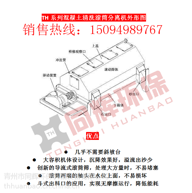 該裝置機械結(jié)構(gòu)簡單,環(huán)保效益顯著:分離出砂石表面光潔,砂子含灰≤1%,含水≤3-5%;洗車水循環(huán)使用,污水達到零的排放;設備耐磨,操作簡單,便于清理檢修。
