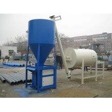 過(guò)傳感器的數(shù)據(jù)反饋,實(shí)現(xiàn)原料計(jì)量。計(jì)量好后的物料,通過(guò)螺旋輸送機(jī)導(dǎo)進(jìn)主斗提機(jī),提升到混合機(jī)上部待混料倉(cāng)中。待混倉(cāng)為氣動(dòng)大開(kāi)門(mén)型,可以迅速將待混物料放入無(wú)重力