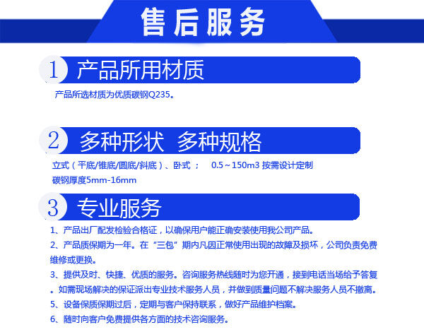 我們公司并可根據(jù)客戶要求制作來(lái)圖來(lái)料加工防腐儲(chǔ)罐。工程質(zhì)量達(dá)到經(jīng)濟(jì)、合理、可靠、可信和優(yōu)良的標(biāo)準(zhǔn)。讓您滿意是我們的追求。為您服務(wù)是我們的職責(zé)?!百|(zhì)量是企業(yè)生存的命脈 ;信譽(yù)是廠家發(fā)展的階梯。” 讓利客戶、規(guī)格生產(chǎn)、成本降低、統(tǒng)一銷售。歡迎廣大客戶來(lái)函、來(lái)電、來(lái)樣咨詢訂購(gòu),讓您買的放心用得安心,與您攜手共創(chuàng)輝煌。