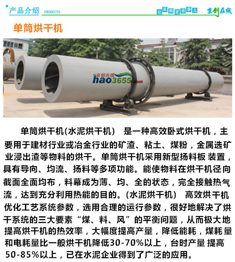 單筒烘干機(jī)φ3×25,也叫滾筒干燥機(jī),它廣泛用于建材、冶金、化工、水泥工業(yè)烘干礦渣石灰石、煤粉、礦渣、粘土等物料。該機(jī)主要由回轉(zhuǎn)體、揚料板,傳動裝置,支撐裝置及密封圈等部件組成。具有結(jié)構(gòu)合理,制作精良,產(chǎn)量高,能耗低,運轉(zhuǎn)方便等優(yōu)點。