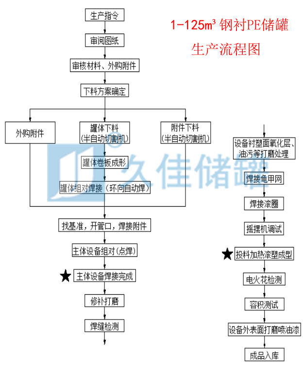 工藝: 鋼襯塑儲(chǔ)罐是以聚乙烯(PE)/聚烯烴(PO)為原料,采用旋塑工藝(滾塑技術(shù))一次整體成型。將鋼網(wǎng)焊接于鋼體表面,使鋼體表面、鋼、網(wǎng)、塑復(fù)合形成一個(gè)整體。